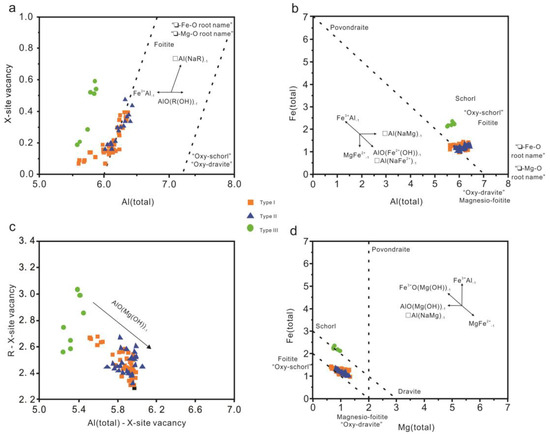 Binary diagrams showing the main substitutions in tourmaline. (a) Al(total) vs. X-site vacancy plot. (b) Al(total) vs. Fe(total) plot. (c) Al(total) − X-site vacancy vs. R − X-site vacancy plot. (d) Mg(total) vs. Fe(total) plot. Diagrams after reference [24]. R = Mg + Fe + Mn. The directions of selected exchange vectors are shown for reference.
