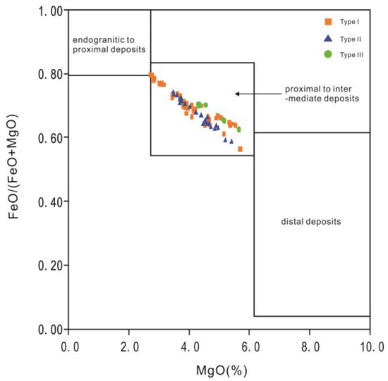 In addition, as proposed by Pirajno and Smithies [60], the FeO/(FeO + MgO) ratio of tourmaline could be a useful indicator of spatial variations in granite-related hydrothermal W-Sn deposits hosted in siliclastic metasedimentary rocks. Systematic variations of the FeO/(FeO + MgO) ratio are observed from endogranitic deposits to distal vein systems emplaced at some distance from the granitic source. In Figure 2, the Pankou and Pukouling granites are closely related to Triassic metasedimentary strata. The higher Mg and Fe compositions of type III tourmaline, compared with type I and type II tourmalines, indicate that the biotite schist does contribute to the Xuebaoding deposit. With the FeO/(FeO + MgO) ratios ranging from 0.8 and 0.6, all types of tourmalines plot into the proximal to intermediate field. However, although such a result can not show the specific distance between the ore body and granites, it could be used as a reference suggesting that tourmalines formed as a result of fluid flow a distance from the intrusion (Figure 8).