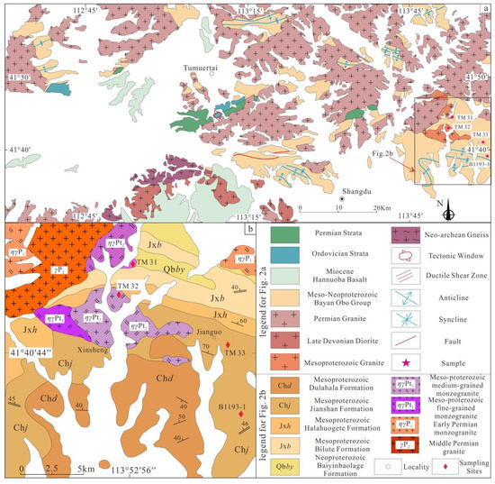 Simplified geological map of the study area. (a) Geological map of the Shangdu Area (after [51]); (b) sketch geological map of the sampling area.