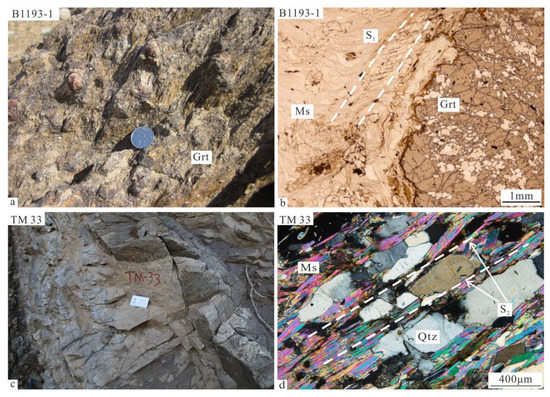 Sample B1193-1 is a strongly deformed garnet muscovite schist from the Jianshan Formation in the northeastern part of Shangdu (GPS position: 113°59′11″ E, 41°39′50″ N). The main minerals include quartz (25 vol.%) and characteristic metamorphic minerals such as muscovite (55 vol.%), biotite (10 vol.%), and garnet (10 vol.%). The quartz exhibits undulose extinction (Figure 3a,b). The diameters of the garnets are up to 1.5 cm. The muscovite and biotite define the NE-trending foliation (S1).