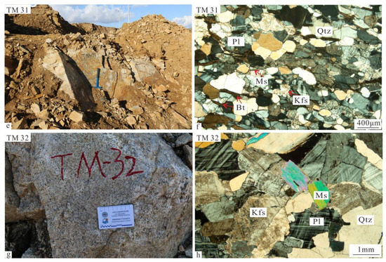 Sample TM32 is a medium-grained muscovite monzogranite sampled 3 km southwest of sample TM31 (GPS position: 113°51′56″ E, 41°43′12″ N). It is also less deformed without foliation. Its main minerals are K-feldspar (30 vol.%), plagioclase (25 vol.%), quartz (35 vol.%), and muscovite (10 vol.%). The K-feldspar is altered to kaolin, and the plagioclase exhibits polysynthetic twinning (Figure 3g,h).