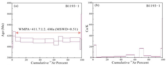 The 40Ar/39Ar step-heating geochronology data are shown in Table 2. The Ca/K ratio spectra of these four samples is in Figure 4b,d,f,h. Twelve heating steps were carried out for sample B1193-1. Ten heating steps with temperatures ranging from 910 °C to 1400 °C yielded a plateau age of 412 ± 3 Ma (MSWD = 0.51), including a total of 95.1% of the released 39Ar (Figure 4a).