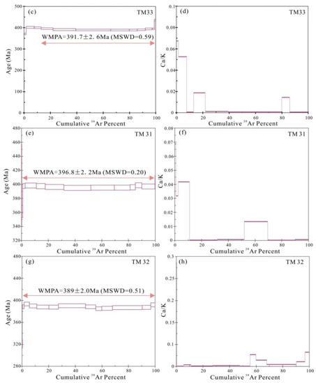 Thirteen heating steps were carried out for sample TM32. Twelve steps with temperatures ranging from 740 °C to 1400 °C yielded a well-defined plateau age of 389 ± 2 Ma (MSWD = 0.51) (Figure 4g), including a total of 99.7% of the released 39Ar.