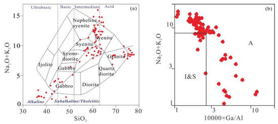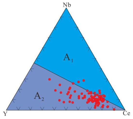- Eby, G.N. Chemical subdivision of the A-type granitoids: Petrogenetic and tectonic implications. Geology 1992, 20, 641–644. [Google Scholar] [CrossRef]