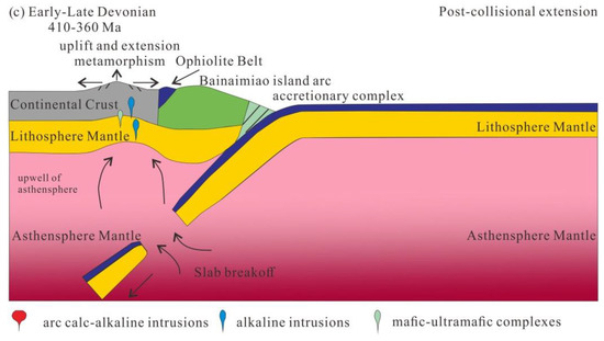 The slab breakoff, also referred to as slab detachment, occurs when part of a subducted lithospheric plate detaches and sinks into the mantle [79,80]. Slab breakoff will lead to the upwelling of hot and dehydrated subslab asthenosphere and resultant heating up of the overriding lithosphere; thermomechanical modeling of the slab-detachment shows large (500 °C) transitory heating of the base of the upper plate for several million years due to upwelling mantle following the slab detachment [81]. Therefore, the melting of enriched layers and lower continental crust will be possible, causing the formation of Devonian alkaline magma and mafic-ultramafic rocks. Besides, the propagation of slab breakoff will produce a linear zone of lithospheric heating and the area overlying the breakoff line is therefore predestined to form a tectonic fault [75]. The magmatism also occurs along a narrow linear zone roughly parallel to the trench and is confined in time, which makes slab breakoff distinct from other models for syncollisional and post-collsional magmatism, such as subduction melting, delamination, or thermal boundary layer detachment [75]. Regarding the fact that the Devonian alkaline rocks develop in a linear zone along the northern NCC (Figure 1b), the slab breakoff will be the most suitable model for this distribution of the alkaline rocks. In addition, the slab breakoff is followed by a period of uplift that reaches about 1.5 km within about 20 Ma [79]. Slab breakoff has caused uplift and exhumation because the dynamic subsidence related to subduction stopped coevally with the removal of large loads of lithosphere mantle [76]. The rare preservation of Devonian strata in the northern NCC also proves the existence of uplift event [82]. Besides, in combination with the heat input from upwelling asthenosphere, the uplift and exhumation would lead to thermal metamorphism in the overriding plate. However, this relevant Devonian metamorphism has rarely been reported before. The muscovite 40Ar-39Ar ages presented could constrain the time interval of the Devonian metamorphism and exhumation process in the study area. Therefore, the magmatism, deposition history, and metamorphism during Early-Late Devonian in the northern NCC testified slab breakoff would be a suitable model for the post-collsion evolution.