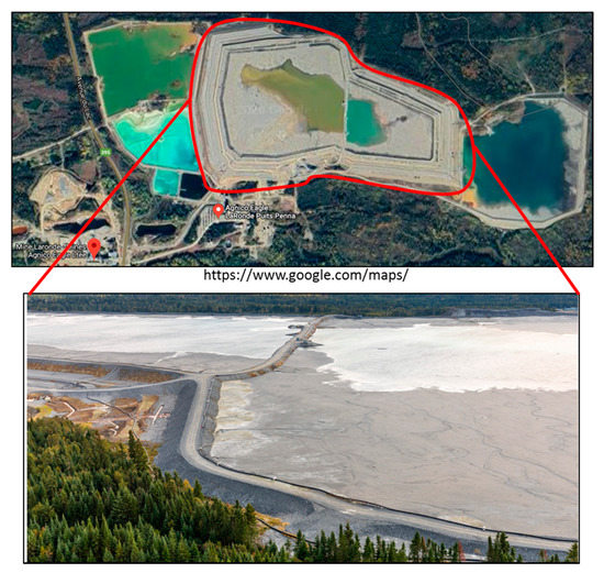 This study is part of a research program which aims at evaluating the use of alternative materials in cover systems used to reclaim mine sites [1,2,3,4,5,6,7,8,9]. Materials for this study were gathered from the LaRonde mine site, which is located approximately 47 km west of Rouyn-Noranda (48°15′16″ N, 78°26′4″ W; Quebec, Canada) and is owned and operated by Agnico Eagle Mines (AEM, Canada). The site has been in operation and producing precious and base metals since 1957. The LaRonde deposit is composed of gold–copper and zinc–silver mineralization in the form of lenticular layers of massive and disseminated sulfides. Copper and zinc concentrates are produced by flotation and gold and silver ingots are produced by cyanidation and electrowinning. The LaRonde underground mining complex generates approximately 2.4 Mt of acid-generating tailings annually, which are disposed in a 165 ha tailings storage facility (TSF; Figure 1).