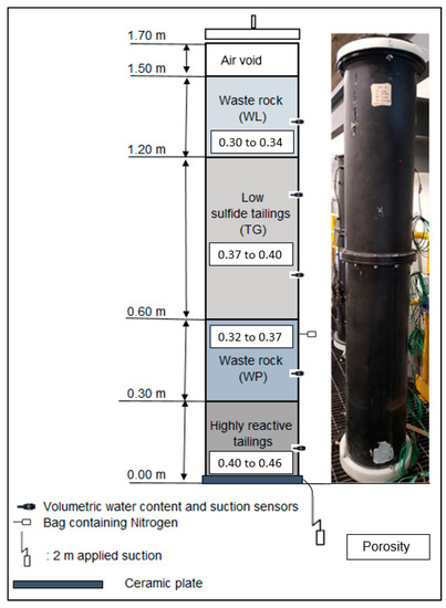 An HDPE column 170 cm in height and 30 cm in diameter was constructed to study the hydrogeochemical behavior of a CCBE made with mine waste materials. The column was filled from bottom to top with: TR (0.3), WP (0.3) as the bottom capillary break layer (CBL), TG (0.6 m) as the fine-grained moisture-retaining layer (MRL), and WL as the top CBL (0.3 m) or drainage layer (Figure 2). The reactive tailings and cover materials were placed in the column in 10- to 20-cm-thick layers and compacted using a Proctor hammer until reaching the target porosity (approximately 0.45 and 0.35 for the tailings and waste rock, respectively). The top of the column was left open to the atmosphere. The laboratory column required a gas relief valve to avoid a gas lock or a vacuum during drainage from a saturated condition at the beginning of each cycle [23]. A nitrogen-filled gas bag was attached to a valve to prevent oxygen contamination during drainage (see Figure 2). The boundary condition at the bottom of the column was controlled by a porous ceramic plate and a drainpipe, which maintained the water table level approximately 2 m below the base of the column. This water table level is a typical value observed in the field and it ensures that bottom waste rock layer desaturates and generates the desired capillary barrier effects [5].