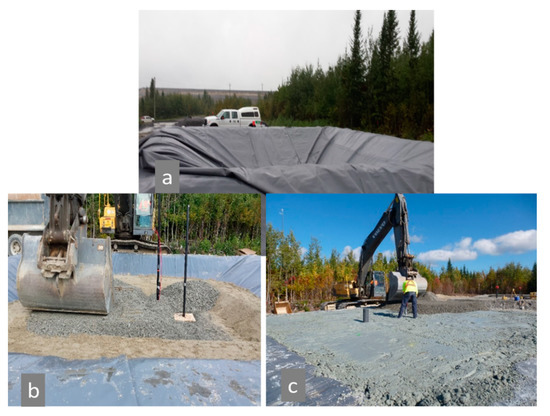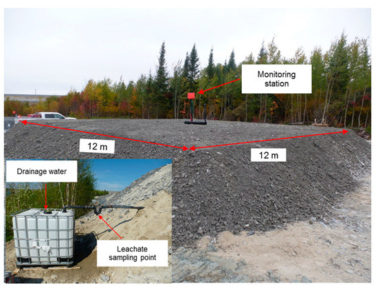 The field experimental cell was built in early autumn 2016 at the LaRonde mine site; similar cells have been used to assess the performance of reclamation scenarios to control AMD [16,17,18,27]. An excavation was created in a waste rock pad with a hydraulic excavator. The periphery of the excavation was filled with waste rock to give the cells the shape of an inverted truncated pyramid. The interior sides of the cell were sloped (2H:1V) to obtain the desired size and geometry, lined with a geomembrane (Figure 3a), and a drainpipe was installed at the bottom to recover water drainage from the cell (see [22] for more details). The cell was filled with the same materials as the laboratory column from the bottom to the top: TR (1.00), WP (0.30), TG (0.60), and WL (0.30 m) (Figure 3b,c). The surface of the cell was horizontal and had an area of approximately 144 m2 (12 m × 12 m) (Figure 4). The top of the cell was open to natural infiltration. The outlet of the water drain was equipped with a sampling point and connected to a tote tank with a capacity of more than 1000 L in order to quantify the volume of the drainage water (Figure 4).