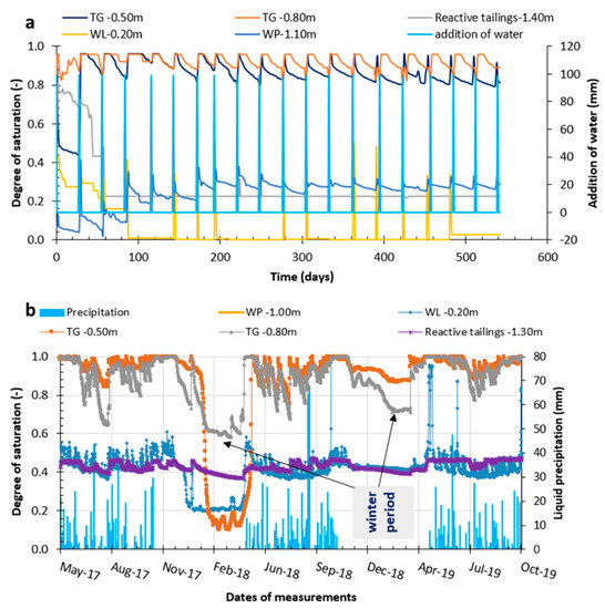 Measured θ values were converted to Sw using the average porosity, n, of each layer that was determined at the start of the experiments (Figure 2 and Figure 5). For the laboratory column, average Sw values were between 5 and 50% in the two waste rock CBLs and between 89 and 96% in the low-sulfide MRL (Figure 6a). Sw values were higher at the beginning of each cycle when water was added to the column, then gradually reduced during the drainage period. Higher Sw values (approximately 50%) were occasionally observed in the top CBL due to the accumulation of water at the interface with the MRL; however, Sw values rapidly returned to lower values after infiltration into the MRL. As expected, Sw values were generally higher at the bottom of the MRL than at the top (due to the suction gradient).