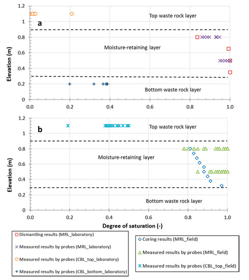 Degree of saturation measured in the moisture-retaining layer (MRL) and capillary break layer (CBL) and post-testing measurements: (a) Laboratory column and (b) field cell.