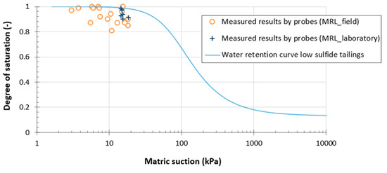 Degree of saturation and matric suction measured in the MRL compared to water retention curve of the low-sulfide tailings.