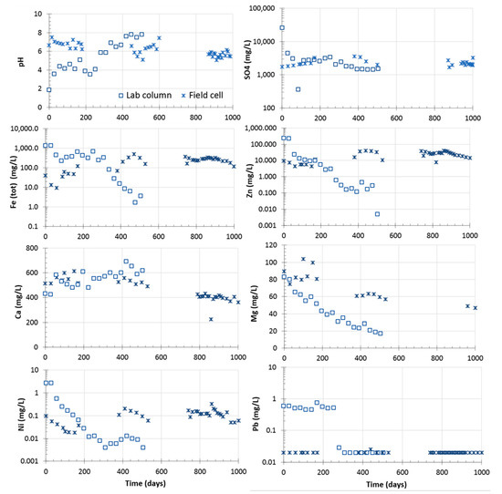 Figure 9 shows pH values, sulfate concentrations, and concentrations of different metals in drainage waters of the laboratory CCBE column and field experimental cell. In the field, the periods from 200 to 350 days and 520 to 720 days correspond to the winter periods during which leachates were not sampled because of frozen conditions.
