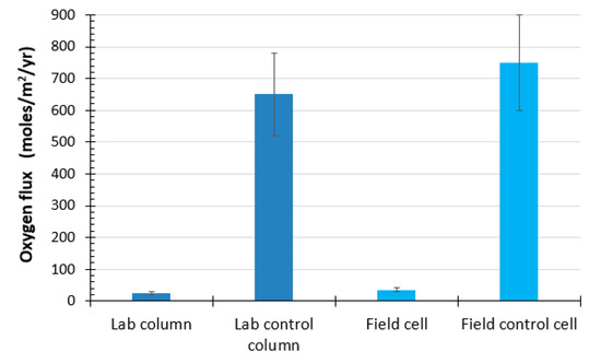 The decreases in oxygen concentrations over time recorded for the laboratory columns and field experimental cells were converted into steady-state oxygen fluxes passing through the cover (Section 3.2). The average oxygen fluxes passing through the surface of the MRL were 25 moles/m2/yr for the CCBE column and 35 moles/m2/yr for the CCBE field cell (Figure 10). For the control column and field control cell, oxygen fluxes averaged 650 and 750 moles/m2/yr, respectively, demonstrating the high reactivity of the material [48]. The values presented here are the average of the OCT results that were performed three times (beginning, middle, and end of the testing period) in the laboratory, and four times during the monitoring period in the field. Variations in oxygen fluxes between the tests were between 15 and 20%. The oxygen fluxes observed in the CCBE column and CCBE field cell demonstrate the ability of the CCBE to limit the migration of oxygen. These tests confirm that a CCBE made of low-sulfide mine wastes can significantly reduce the oxygen fluxes reaching reactive tailings (by a factor of 25 to 30).