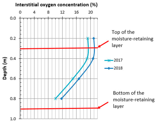 Interstitial oxygen concentration values obtained in the field cell (measured in August 2017 and August 2018).
