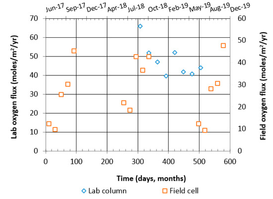 As a reminder, assumptions made for converting sulfate produced into oxygen fluxes were that oxygen was the only oxidizing agent, which is realistic at near-neutral pH, and that there was no sulfate storage in the system before measuring its concentration [28]. These assumptions were not valid for the first 300 days of the column tests during which the pH was low (~1.8–4.5). For this reason, the SRM was considered valid only for the monitoring period from 300 to 504 days. For the field cell, the SRM was considered valid for the entire monitored period.