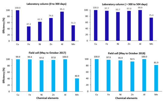 The efficiency of the CCBE column was calculated separately for the period between 0 to 300 days and the period between 300 and 504 days. The latter period corresponds to the geochemical equilibrium state (or the time needed to expulse the initial pore water contamination) during which the pH stayed above 6 and fluctuations in the concentrations of contaminants were minimal. The CCBE field cell efficiency was calculated for the years 2017 and 2018. The results were split into two graphs to see the change in efficiency from one year to the other. The geochemical results of reactive tailings alone (i.e., the control column and field control cell) are summarized in Table 4 and were presented in the companion article [22].