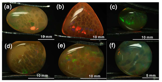 Cabochon samples. (a) Opal-01; (b) Opal-02; (c) Opal-03; (d) Opal-04; (e) Opal-05; (f) Opal-06.