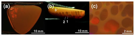 Opal-02 showing the characteristic digit pattern. Columns (1) are transparent with a vivid play-of-colour, separated by common opal matrix (2); (a) The top of the sample is covered by common opal (3); (b) When viewed from the perpendicular direction, the surface shows a finger-light structure. Transparent areas are the vertical sections of parallel columns and rounded at one end; (c) When viewed from the bottom of the sample, the surface shows a mosaic pattern. The transparent rounded patches are cross sections of columns, separated by an opaque matrix composed of common opal [23].