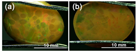 The diameter of the silica spheres from the Wegel Tena opal we observed are between 120 and 500 nm, and most of them conform to the calculations of Equation (3). Although the diameters of some silica spheres are extremely small, the diameter of the agglomerates formed by them is about 200 to 580 nm, which conforms to the conditions needed for diffraction, so play-of-colour is possible. Thus, the play-of-colour in Wegel Tena opal can be caused by a three-dimensional diffraction grating formed by silica spheres, including monochromatic diffraction and a layering of play-of-colour that can be shifted from red to yellow to green. The layering of play-of-colour is caused by the gradual change in the silica sphere size—the diameter of the sphere in the red region is larger, and the diameter of the sphere in the green region is smaller. According to [23], the red layer corresponds to the bottom and the green layer to the top. We observed this phenomenon in Opal-01 (Figure 7a). The sedimentation sequence of silica spheres is controlled by gravity, which leads to the deposition of larger spheres first, followed by progressively smaller spheres [23].