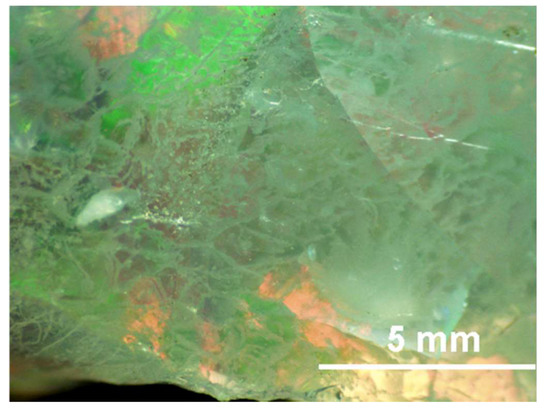 In addition to the above two phenomena, Wegel Tena opal can also show rainbow-like continuous spectral colours (Figure 7c), similar to iridescence. Visible interference can occur between the silica layer and the gap between layers. The colour is related to the incident angle of light and the thickness of the silica layer. The interference colour formula for thin-film interference is determined by the following Equation (4) [52]: