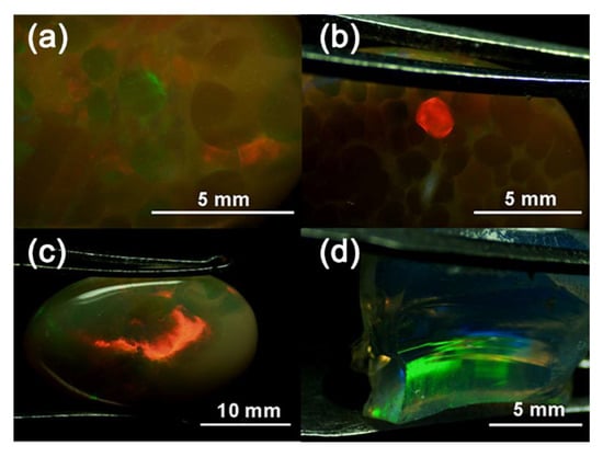 - Gaillou, E.; Fritsch, E.; Rondeau, B.; Aguilar-Reyes, B.; Barreau, A.; Ostroumov, M.; Post, J. Common gem opal: An investigation of micro- to nano-structure. Am. Miner. 2008, 93, 1865–1873. [Google Scholar] [CrossRef]