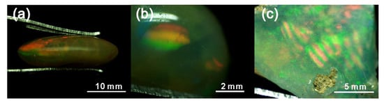 The play-of-colour patches are bright and two-dimensional silk-like, flaming, flaky, or band-shaped, and show bright and dark stripes parallel to each other (Figure 6). A single patch usually consists of only one colour in one direction of observation, and a continuous spectral colour also appears. There are two kinds of spectral colours, one being the pure spectral colour with clear boundaries (Figure 7a,b), and the other being the spectral gradient colour with blurred boundaries (Figure 7c). In most samples (e.g., Opal-02, see Figure 3), play-of-colour appears only in columns, and the matrix is common opal. A patch can be divided into parts by the matrix, and on adjacent columns, the shape and texture of the colour patch are continuous (Figure 3). Sometimes, play-of-colour can be seen on both columns and matrix (Figure 4). A patch on columns can be divided by the matrix, and a patch on the matrix is divided by columns. The patches on these two types of areas are not connected to each other.