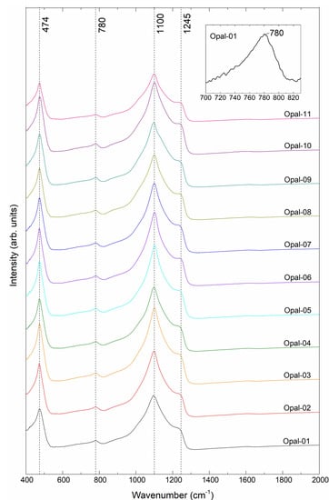 The infrared reflectance spectra of all samples are similar (Figure 8), with three strong bands around 474, 780 and 1100 cm−1, relating to the fundamental Si–O vibrations. An inflexion point appears around 1245 cm−1. The 1100 cm−1 band is caused by the antisymmetric stretching vibration of Si–O (νas (Si–O)), and the 780 cm−1 band is caused by the symmetric stretching vibration of Si–O (νs (Si–O)). The 474 cm−1 band is related to O–Si–O bending vibration δ (O–Si–O) [5,27,28,29,30,31,32,33]. The transition from the amorphous to the crystalline form is evident in the FTIR spectra. One characteristic of this transition is a significant inflexion point at 1245 cm−1 [34,35]. Opal-C can be identified by the absorption appearing at 480, 620, 675, 800 and 1110 cm−1, especially the intense bands at about 630 cm−1 [5,6,7]. The infrared spectra of our samples are obviously different from those of opal-C, and more similar to the spectra of opal-A and opal-CT. The symmetric stretching vibration of the Si–O absorption band in opal-CT is in the range of 788 to 792 cm−1, while this band is at 796 to 800 cm−1 in opal-A [5]. The band measured in this study is around 780 cm−1, which is the closest to the opal-CT.