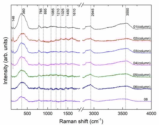 Sharp bands at 148 cm−1 are observed in Opals 01 to 04, which are attributed to anatase [42,43,44]. Anatase also has bands at 397, 516 and 640 cm−1, which can affect the intensity and shape of the broad band at 360 cm−1. A small amount of dark anatase inclusions can be observed in those samples with the microscope equipped with a Raman spectrometer. The size of anatase inclusions in our samples is about 1 μm. We subtracted the spectrum of anatase [44] in proportion, and concluded that the impact of anatase on this broad band was very limited. Since our aim was to compare the spectra of different regions on the same sample, and the presence of anatase was not sufficient to affect the comparison of the relative intensity of tridymite and cristobalite type regions, we did not take account of the influence of anatase in the subsequent data analysis.