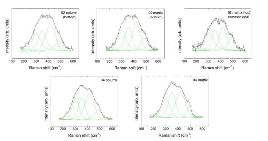 We chose Raman spectra in different areas on the sample for comparison, including (1) The column and matrix at the bottom, and the common opal on the top of Opal-02 (respectively corresponding to “1”, “2” and “3” in Figure 3); (2) The column and matrix on Opal-04. Raman spectra data in the range of 170 to 600 cm−1 were fitted with five Voigt functions to understand the structure state of the samples (Figure 10). Band parameters after fitting are listed in Table 2.