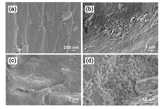 Layers and silica aggregates observed by SEM. (a) Opal-01 shows a layered structure; (b) Silica aggregates of various shapes and agglomerates on Opal-08 (diameters 130–500 nm); (c) Blurred boundary of Opal-09; (d) Close-packed small spheres on the surrounding rock of Opal-09 with diameters of 2.2–3.8 μm (2200–3800 nm).