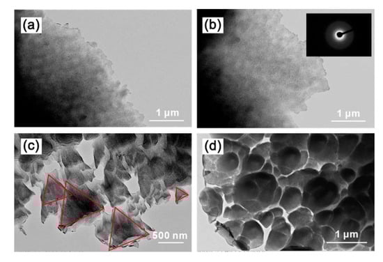 Opal observed by TEM. (a) Silica spheres in columns (d = 210–240 nm) from Opal-05; (b) Silica spheres in the matrix (d = 230–260 nm) from Opal-05; (c) The silica particles in columns from Opal-06 are arranged in pyramids, the width of the cone is about 840–900 nm, and the height is about 780–800 nm; (d) Silica spheres in the matrix (d = 250–580 nm) with a clear boundary from Opal-06, composed of small spheres, the diameters of which can be as small as 50 nm.