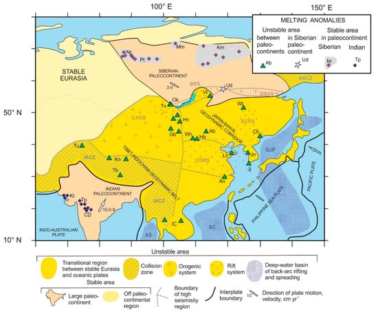 Distribution of selected late Phanerozoic melting anomalies in unstable and stable parts of Asia. The Japan-Baikal geodynamic corridor: Ch—Changbai, Jn—Jeungok, Wl—Wudalianchi, Ab—Abaga-Dalenyuor, Ln—Linju, An—Anhui, Hb—Hannuoba, Wh—Wulanhada, Gb—Gobi, Hn—Hangay, Vt—Vitim, Ud—Udokan, Tv—Tuva, Ok—Oka. The Tibet-Indochina geodynamic belt: Tu—Tuyun, Kn—Kunlun, Tb—Tibet, Ic—Indochina. The Indian paleocontinent: Kt—Kutch, Tp—Tapi Rift, CD—Central Deccan. The Siberian Paleocontinent: Nr—Noril’sk, Pt—Putorana, Mm—Meimecha, Km—Siberian kimberlite province. Mobile systems of unstable Asia: Indo-Asian (IACZ) and American-Asian (AACZ) collision zones; Central Asian (CAOS) and Olekma-Stanovoy (OSOS) orogenic systems; Baikal (BRS), Circum-Ordoss (CORS), and East China (ECRS) rift systems; Okhotsk-Japan-Philippine (OJP), South China (SC), and Andaman Sea (AS) deep-water basins of back-arc rifting and spreading. The mobile systems and Japan-Baikal geodynamic corridor are shown after [,].