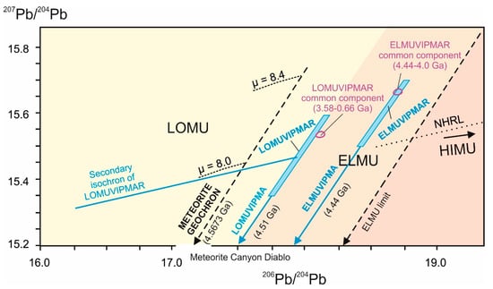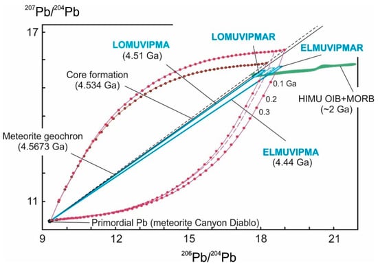 Schematic diagram of uranogenic Pb evolution. Shown are the meteorite geochron [], the core formation line, the HIMU OIB + MORB trend [], and the LOMUVIPMA and ELMUVIPMA lines (this work). The LOMUVIPMA and ELMUVIPMA lines yield limited compositions LOMUVIPMAR and ELMUVIPMAR that originated from stepwise solidification of the planetary magma ocean. All geochrons are focused on the primordial lead isotope ratios determined in a troilite from the Canyon Diablo meteorite (Nanton): 207Pb/204Pb = 10.307094, 206Pb/204Pb = 9.305875 [].