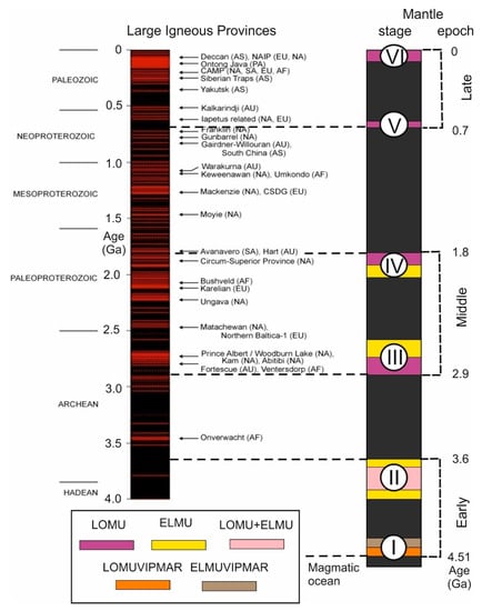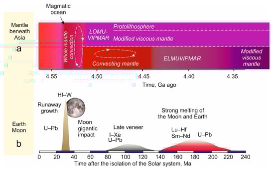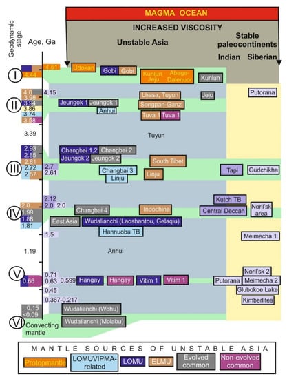 The obtained ages of protoliths in mantle sources of volcanic rocks erupted in unstable Asia, are presented on a time scale as a sequence of six time intervals. The first interval (Hadean, 4.51–4.44 Ga ago) indicates a generation of viscous protomantle reservoirs from the planetary magma ocean and an early processing of their protoliths. Later intervals are: II—early Archean (4.0–3.6 Ga ago), III—late Archean (2.9–2.6 Ga ago), IV—Paleoproterozoic (2.0–1.8 Ga ago), V—Neoproterozoic (about 0.7–0.6 Ga ago), and VI—late Phanerozoic (<0.25 Ga ago). The intervals obtained for sources of volcanic rocks from unstable Asia are compared with ages of sources for volcanic rocks from stable paleocontinents (Figure 4).