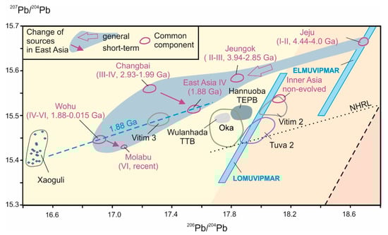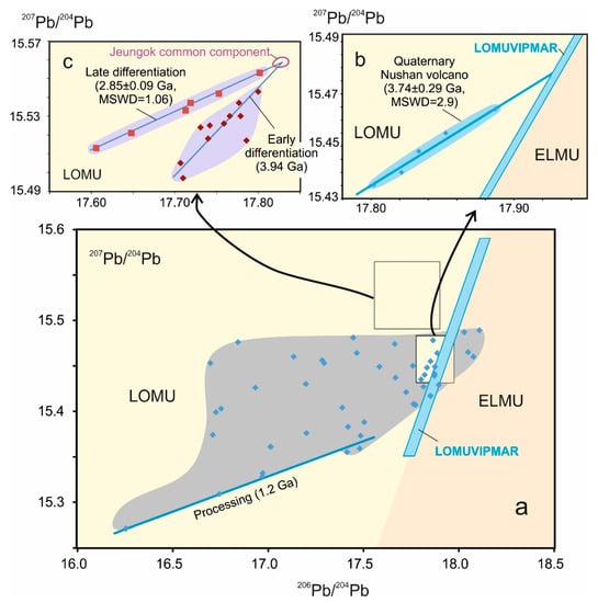 Diagrams of 207Pb/204Pb versus 206Pb/204Pb for volcanic rocks from the Anhui province (a), Quaternary volcano Nushan of this province (b), and Jeungok volcanic field (c). In diagrams (a,b), the LOMUVIPMAR composition and LOMU–ELMU discriminating line are shown as in Figure 5. In diagrams (b,c), calculations of the secondary errochron 3.74 Ga and secondary isochron 2.85 Ga, respectively, were performed using the Isoplot program []. The Jeungok common component shows relatively radiogenic Pb. Data are from [,,,].