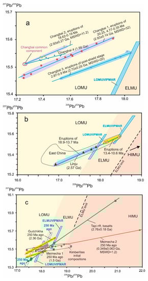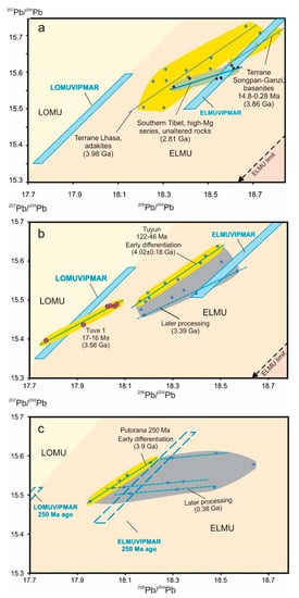 Diagrams of 207Pb/204Pb versus 206Pb/204Pb for volcanic rocks from the volcanic fields of Tibetan Plateau (a), Tuyun basin (Chinese Tien Shan) and Tuva (Eastern Sayans) (b), and Putorana Plateau (north of the Siberian paleocontinent) (c). In diagrams (a,b), the LOMUVIPMAR and ELMUVIPMAR compositions, as well as LOMU–ELMU and ELMU limit discriminate lines are shown as in Figure 5. In diagram (c), data points of traps and the LOMUVIPMAR and ELMUVIPMAR compositions were recalculated to the age of 250 Ma. In diagram (b), calculation of the secondary errorchron 4.02 Ga was performed using the Isoplot program []. Data are from [,,,,,,]. Late Archean (2.9–2.6 Ga).