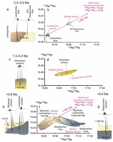 Illustrations of sources and diagrams 207Pb/204Pb versus 206Pb/204Pb of potassic lavas from the Wudalianchi volcanic field: (a,b)—Laoshantou and old Gelaqiushan flows, (c,d)—Wohushan volcano, (e–g)—Bijiashan, Laoheishan, and Molabushan volcanoes. In diagram (b), calculation of the secondary isochron 1.88 Ga was performed using the Isoplot program []. Modified after [].