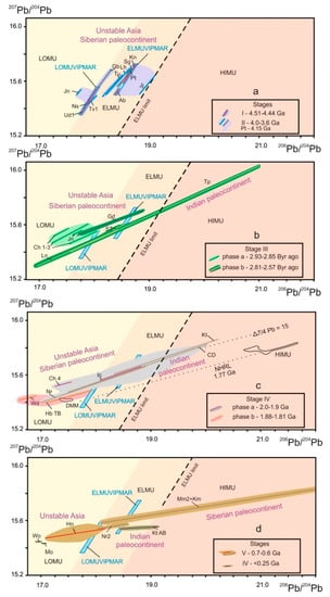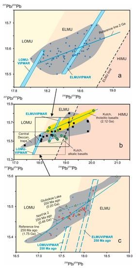 Diagrams of 207Pb/204Pb versus 206Pb/204Pb for volcanic and intrusive rocks from Indochina (a), Indian paleocontinent (b), and Siberian paleocontinent (Noril’sk area) (c). In diagrams (a,b), the LOMUVIPMAR and ELMUVIPMAR compositions, as well as LOMU–ELMU and ELMU limit discriminating lines are shown as in Figure 5. In diagram (c), data points of traps and viscous protomantle compositions correspond to the age of 250 Ma. Calculation of the secondary isochron 0.46 Ga was performed using the Isoplot program []. Data are from [,,,,,,,,,,,].