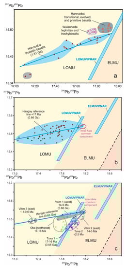 Diagrams of 207Pb/204Pb versus 206Pb/204Pb for volcanic rocks from the Hannuoba and Wulanhada volcanic fields (a), Hangay volcanic area of the southwestern part of the Baikal rift system (b), its northwestern part (Oka, Tuva 1, 2) and northeastern part (Vitim 1–3, Udokan 2) (c). The LOMUVIPMAR and ELMUVIPMAR compositions, as well as LOMU–ELMU and ELMU limit discriminating lines are shown as in Figure 5. In diagrams (b,c), designated is the Inner Asia common component of volcanic rocks. Data used are from [,,,,,] and unpublished data of authors.