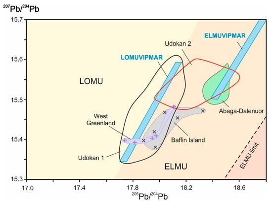 The LOMUVIPMA geochron with a slope of about 4.51 Ga symmetrically approximates a scattered set of data points of volcanic rocks from the northwestern part of the Udokan volcanic field designated as the Udokan 1 unit (Figure 5a). A reason to refer this line to a geochron is its orientation at the primordial lead composition of the meteorite Canyon Diablo. Respectively, the LOMUVIPMAR composition is determined by a range of Pb isotope ratios of the Udokan 1 volcanic rocks (207Pb/204Pb from 15.35 to 15.60 and 206Pb/204Pb from 17.7 to 18.2).