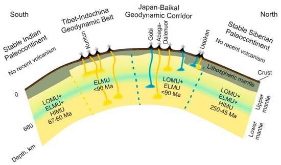 In unstable Asia, occurring between stable regions of the Indian and Siberian paleocontinents, melting anomalies are distributed along the Japan-Baikal geodynamic corridor and Tibet-Indochina geodynamic belt. The former is designated by the Baikal, Circum-Ordos, and East China rift systems and Central Asian and Olekma-Stanovoy orogenic systems, the letter by the Indo-Asian zone of collision and its Indochina flank (Figure 1).