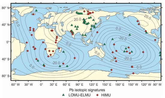 From geochemical and geophysical constraints, the South Pacific and African low-velocity mantle domains were connected also with the HIMU extreme values (206Pb/204Pb > 20). It was proposed that such values were associated with the deep roots of mantle plumes [] or with delamination of the carbonatite-metasomatized subcontinental lithospheric mantle []. No attempts have been done, however, to define the nature of magmatic sources related to the Asian high-velocity mantle domain in terms of their 238U/204Pb (μ) values.
