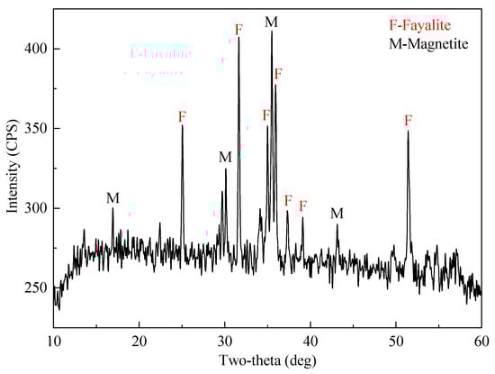 The results of XRD (Figure 1) and mineral composition (Table 2) analyses showed that the main minerals in the Cu slag were fayalite (45.3%), magnetite (19.96%), and amorphous glass silicate (32.56%). In addition, the Cu-bearing minerals were Cu–S minerals (referring to minerals rich in Cu and S, 1.09%), Cu–As minerals (referring to minerals rich in Cu and As, 0.51%) and trace metallic Cu (0.02%).