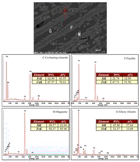 SEM–EDS results of the sample (C—Cu-bearing minerals, F—Fayalite, M—Magnetite, G—Glassy silicates).