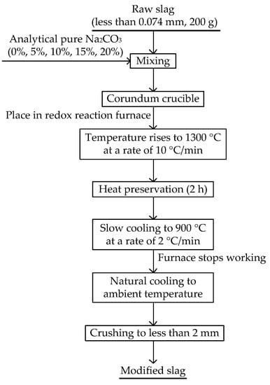 As depicted in Figure 4, the process of melting modification included the following steps. The Cu slag (200 g) with particle size less than 0.074 mm was evenly mixed with a certain amount (5–20%) of analytically pure Na2CO3 and poured into a 200 mL corundum crucible. These percentages represent the ratio of the mass of Na2CO3 to the mass of the raw slag. The crucible was placed into the redox reaction furnace (Figure 5), and the temperature was raised to 1300 °C at a rate of 10 °C/min. The temperature was maintained for 2 h for the temperature inside the furnace and slag to have enough time to become uniform and stabilize. The temperature of the redox reaction furnace was slowly cooled to 900 °C at the speed of 2 °C/min. The redox reaction furnace was opened, and the corundum crucible was naturally cooled to ambient temperature. The modified Cu slag was separated from the crucible by manual crushing, and then crushing to less than 2 mm by using a vibration mill for subsequent experiments.