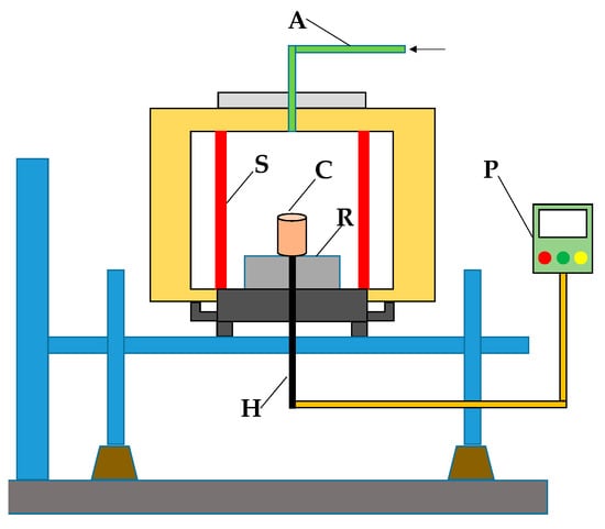 Schematic of the redox reaction furnace (A—Air intake, S—Silicon–Molybdenum Bar, C—Corundum crucible, R—Refractory base, H—Heating couple, P—Programmable Logic Controller).