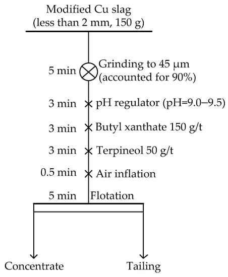 The whole flotation test consisted of two steps. A total of 150 g modified slags was ground to less than 45 μm (accounted for 90%). This fine slag was used for the flotation operation in accordance with the procedures shown in Figure 6. In the flotation process, the speed of the spindle of the flotation machine, speed of scraper, and aeration volume were 2150 r/min, 1950 r/min, and 8 dm3/min, respectively. The results of this flotation test were used to evaluate the modification effect of Na2CO3 on Cu slag.