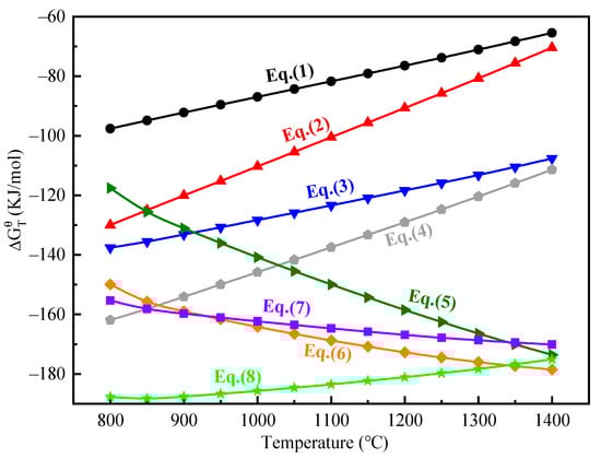 Figure 7 shows the relationship between the standard Gibbs free energy () of reactions (2)–(9) and temperature. The Gibbs free energy of reactions (2)–(9) is negative at 800–1400 °C, indicating that reactions (2)–(9) can occur spontaneously. The Gibbs free energy of reactions (4)–(9) is lower than that of reactions (2) and (3) at the same temperature, indicating that reactions (4)–(9) are more likely to happen. With no additive (reactions 2 and 3), fayalite is oxidized to SiO2, Fe3O4, and Fe2O3 with melting points of 1650 °C, 1594.5 °C, and 1565 °C, respectively. The melting points of these three substances are higher than the temperature of just discharged molten Cu slag (1300 °C). Therefore, these high-melting point materials crystallize and precipitate rapidly in the slag system, causing a sharp increase in the viscosity of the slag system. When Na2CO3 is added (reactions (4)–(9)), Fe3O4 or Fe2O3 with a high-melting point is formed in the reaction between fayalite and Na2CO3, but the Si element no longer exists as SiO2 with a high-melting point. By contrast, the Si element exists in the form of Na2SiO3, Na4SiO4, and NaFeSiO6 with low-melting points (1089 °C, 1088 °C, and 990 °C, respectively) [].