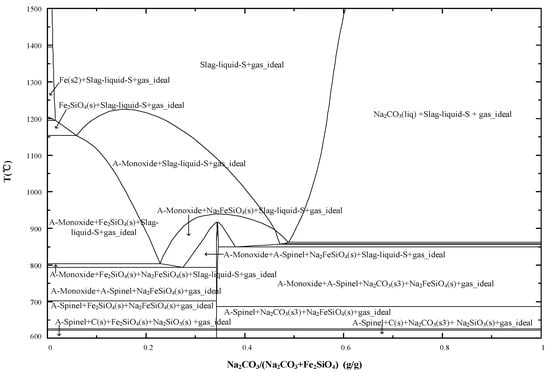 The composition of matte generally determines its phase transition temperature. According to the Cu–Fe–S ternary phase diagram, the phase transition temperature of matte is about 1100 °C []. The melting points of Na2SiO3, Na4SiO4, and NaFeSiO6 are lower than the temperature of just discharged molten Cu slag and the phase transition temperature of matte. Therefore, the addition of Na2CO3 is beneficial to the inhibition of the transformation of fayalite to high-melting point substances and the promotion of the formation of low-melting point substances.