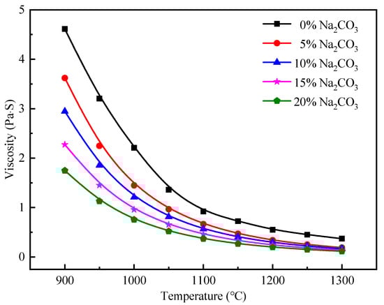 The effect of Na2CO3 dosage and temperature on the viscosity of molten Cu slag is shown in Figure 9. First, the diagram shows that the viscosity of the slag system is higher at a low temperature. This phenomenon is due to the precipitation and crystallization of more high-melting point materials at low temperature []. At temperatures below 1100 °C, the viscosity of the slag system rises sharply because the material with a melting point higher than 1100 °C crystallize and precipitate rapidly. Therefore, the content of high-melting point substances in the slag system should be reduced to decrease the viscosity of the slag system. Second, the viscosity of molten Cu slag decreases evidently with increasing Na2CO3 dosage at the same temperature. This finding shows that adding Na2CO3 in the process of melting modification of Cu slag can promote the transformation of high-melting point substances into low-melting point substances. The results of the viscosity analysis are consistent with those of Section 3.1, which fully shows that Na2CO3 can reduce the viscosity of Cu slag and improve the fluidity of Cu-bearing minerals.